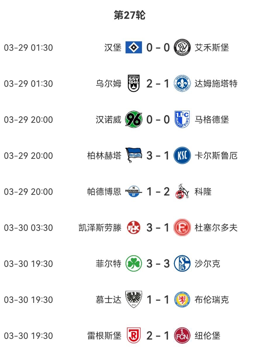 03月30日訊 德乙結(jié)束第27輪比賽,本輪積分榜前中段多支球隊(duì)丟分,原本榜首的漢堡戰(zhàn)平積分被科隆反超,k神執(zhí)教的紐倫堡不敵副班長(zhǎng)雷根斯堡,錯(cuò)失了寶貴的追分機(jī)會(huì)。目前德乙積分榜,科隆榜首,漢堡1分之差位居第二,第3-9名之間的分差只有5分↓ 本文標(biāo)簽: 足球 德甲 五洲