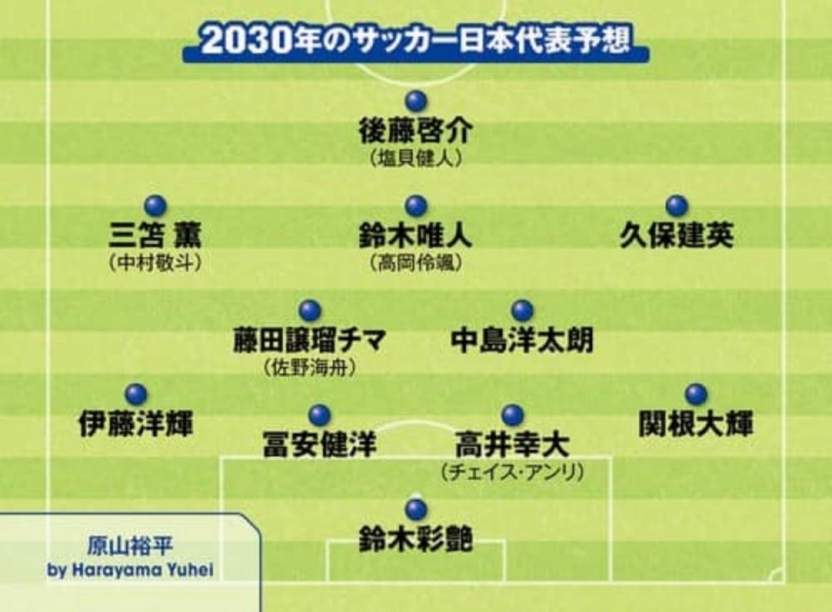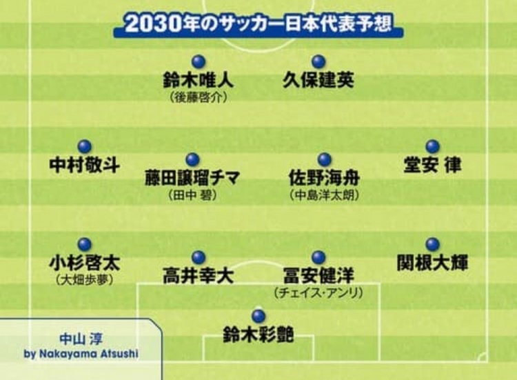 3月30日訊 據(jù)日媒Sportiva報道,近日該媒體開設專欄,開始對2030年世界杯日本隊首發(fā)陣容預測,有部分日本國內的自由撰稿人投稿對首發(fā)進行預測。以上撰稿人預測的陣容中,基本都是本期日本國家隊陣中的年輕球員,并結合部分現(xiàn)役U22國家隊、U20國家隊球員等組合而成。