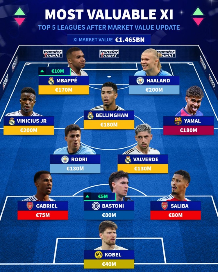 3月31日訊 德國轉(zhuǎn)會(huì)市場更新了五大聯(lián)賽球員的身價(jià),并列出身價(jià)最高陣容,哈蘭德、姆巴佩、維尼修斯、貝林厄姆、亞馬爾在列。