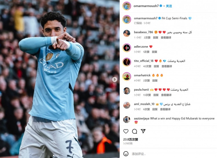 馬爾穆什也在賽后通過(guò)社媒曬出自己的慶祝照,并配文:“足總杯半決賽!”