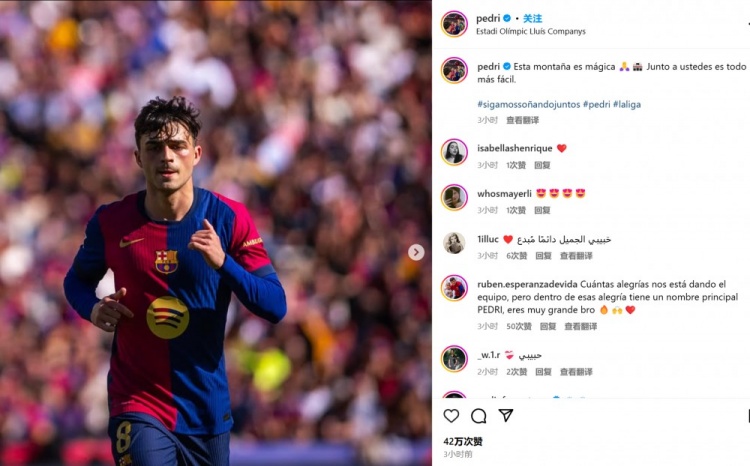 3月31日訊 巴薩在本輪西甲4-1大勝赫羅納,佩德里首發(fā)延續(xù)頂級表現(xiàn)。他也在賽后通過社媒曬出自己的比賽照,并感謝主場球迷:“這座山就像是有魔力一般?????????有你們的支持,一切都變得更容易了!”巴薩當(dāng)前的臨時主場路易斯-孔帕尼斯奧林匹克體育場位于一座臺地之上,也因此被稱為山。 本文標(biāo)簽: 足球 西甲 巴塞羅那 赫羅納