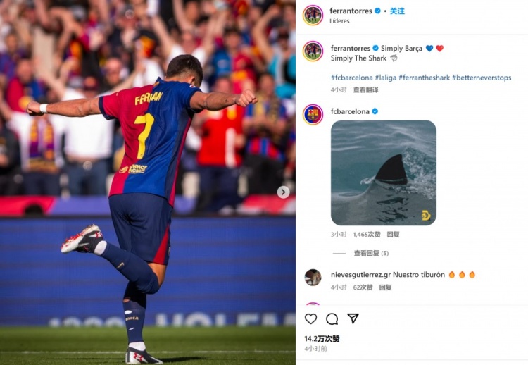 費(fèi)蘭-托雷斯也在賽后通過(guò)社媒曬出自己的慶祝照,并配文:“依然巴薩!依然鯊魚(yú)!”自信而貪婪的鯊魚(yú)精神也是費(fèi)蘭近年一直反復(fù)推崇強(qiáng)調(diào)的。
