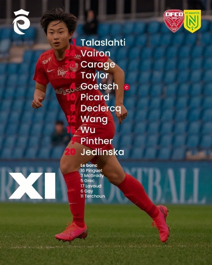 法甲第19輪第戎女足主場3-0戰(zhàn)勝南特女足,吳澄舒、王妍雯首發(fā)出場,第17分鐘,吳澄舒接隊友左路傳中,頭球破門,首開紀錄,連續(xù)兩場有進球入賬。上輪聯(lián)賽第戎客場2-0戰(zhàn)勝勒阿弗爾女足,吳澄舒也斬獲一粒進球。王妍雯打滿90分鐘,傷停補時階段被隊友換下。