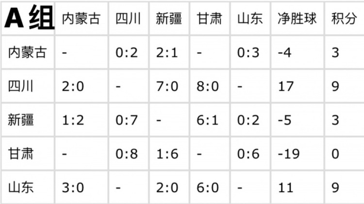 目前,四川和山東同積9分,憑借出色的表現(xiàn)已提前鎖定出線資格。在凈勝球方面,四川以17個(gè)凈勝球領(lǐng)先,山東凈勝球?yàn)?1個(gè)。內(nèi)蒙古和新疆均積3分,甘肅積0分已確定無緣出線。最后一輪比賽,雖無直接影響出線的關(guān)鍵對(duì)決,但各隊(duì)仍會(huì)為榮譽(yù)而戰(zhàn),力求以更好的成績結(jié)束資格賽階段。