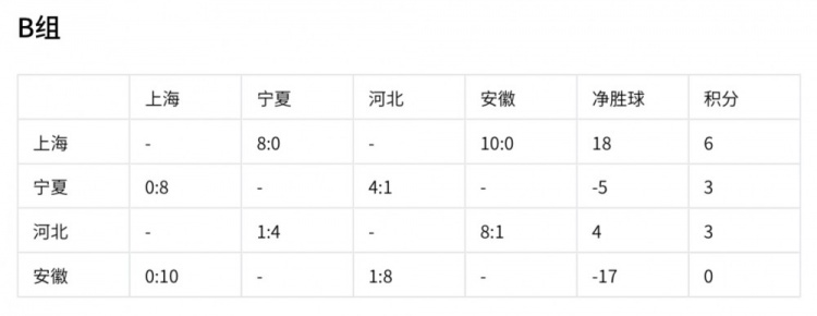 上海隊(duì)以6分、18個(gè)凈勝球的優(yōu)勢(shì)提前出線。寧夏和河北同積3分,寧夏凈勝球?yàn)?-5,河北凈勝球?yàn)?,安徽積0分已出局。最后一輪比賽,各隊(duì)的表現(xiàn)將決定最終排名,寧夏和河北都渴望在最后一戰(zhàn)中爭取更好名次。