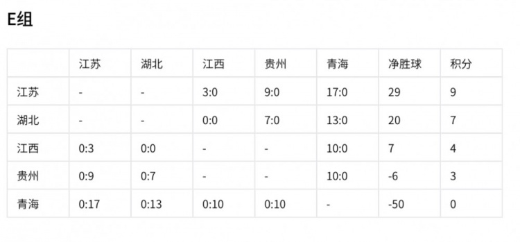 江蘇隊(duì)以9分和29個(gè)凈勝球的絕對(duì)優(yōu)勢(shì)提前出線。湖北積7分、凈勝球20個(gè),出線形勢(shì)大好;江西積4分、凈勝球7個(gè),仍有出線機(jī)會(huì);貴州積3分、凈勝球 -6,青海積0分、凈勝球 -50已出局。最后一輪比賽,各隊(duì)之間的競(jìng)爭將決定剩余出線名額的歸屬,比賽結(jié)果充滿懸念。
