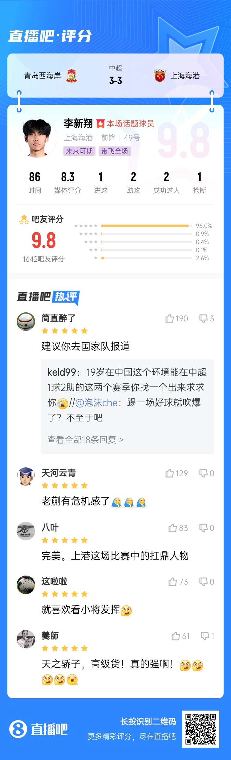 19歲的海港“小孩哥”中超首次先發(fā)1射2傳,讓衛(wèi)冕冠軍極限客場戰(zhàn)平西海岸,似乎又讓球迷看到了一顆未來冉冉升起的新星,看到新的希望!