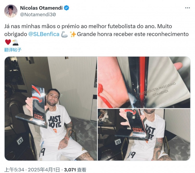 4月1日訊 在上個月的頒獎典禮中,37歲中衛(wèi)奧塔門迪當(dāng)選本菲卡年度最佳球員,奧塔門迪今日在社交媒體上曬出手拿獎杯的照片,并配文:“年度最佳球員獎杯已經(jīng)在我手中,非常感謝本菲卡,很榮幸獲得這一認可?!?/p> 本文標(biāo)簽: 足球 葡超