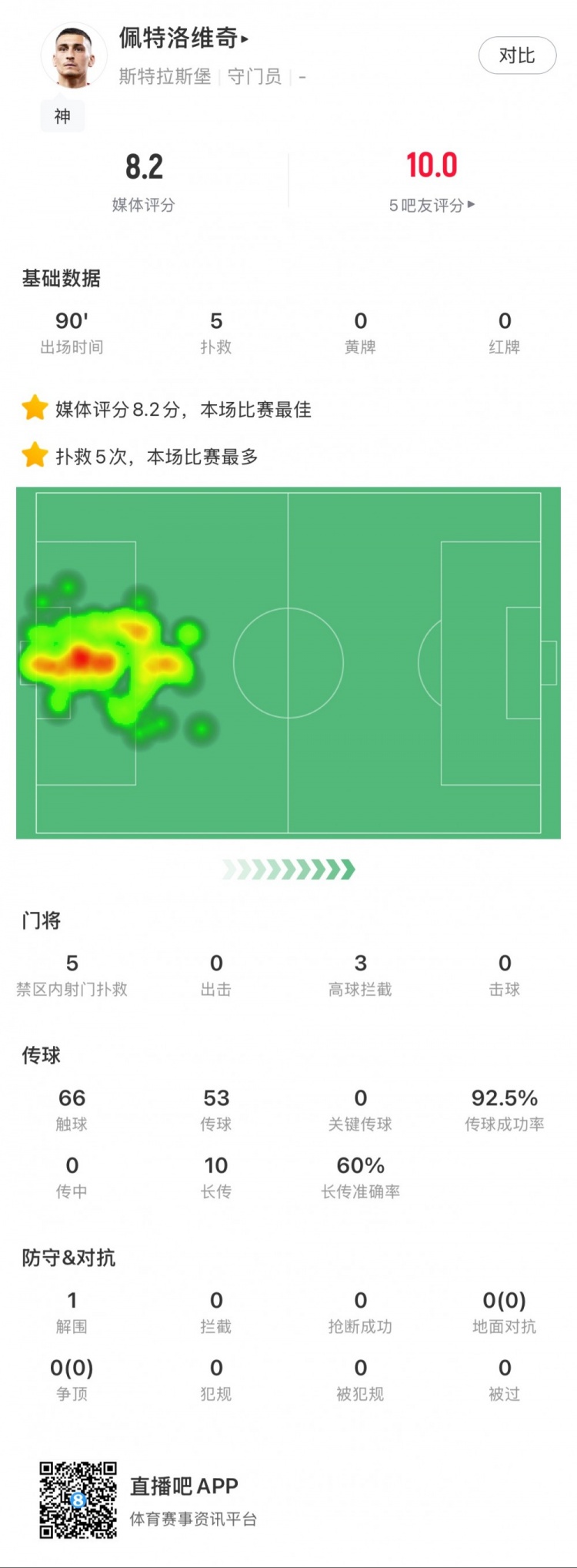 本場比賽中,切爾西外租白堡門將佩特洛維奇送出了5次成功撲救,3次高球攔截,1次解圍,幫助球隊(duì)以2-1的比分獲勝。