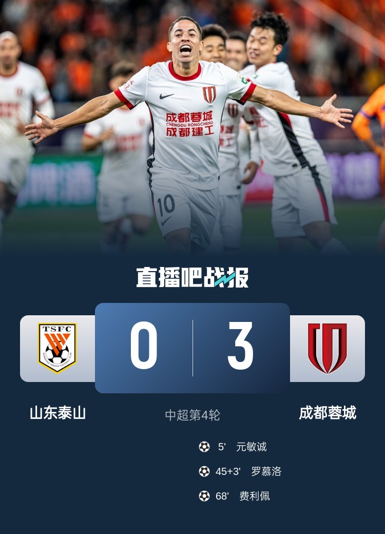 中超第4輪,成都蓉城客場(chǎng)3-0完勝山東泰山,終結(jié)了對(duì)對(duì)手的三連敗。