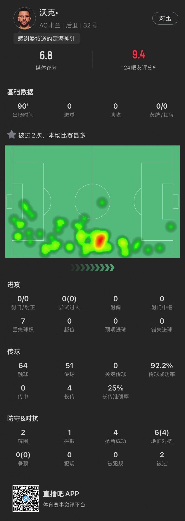 2月3日訊 在剛剛結(jié)束的米蘭德比中,米蘭1-1遭國(guó)米絕平。本場(chǎng)比賽,沃克迎來(lái)了自己的米蘭生涯首秀,最終獲評(píng)6.8分。