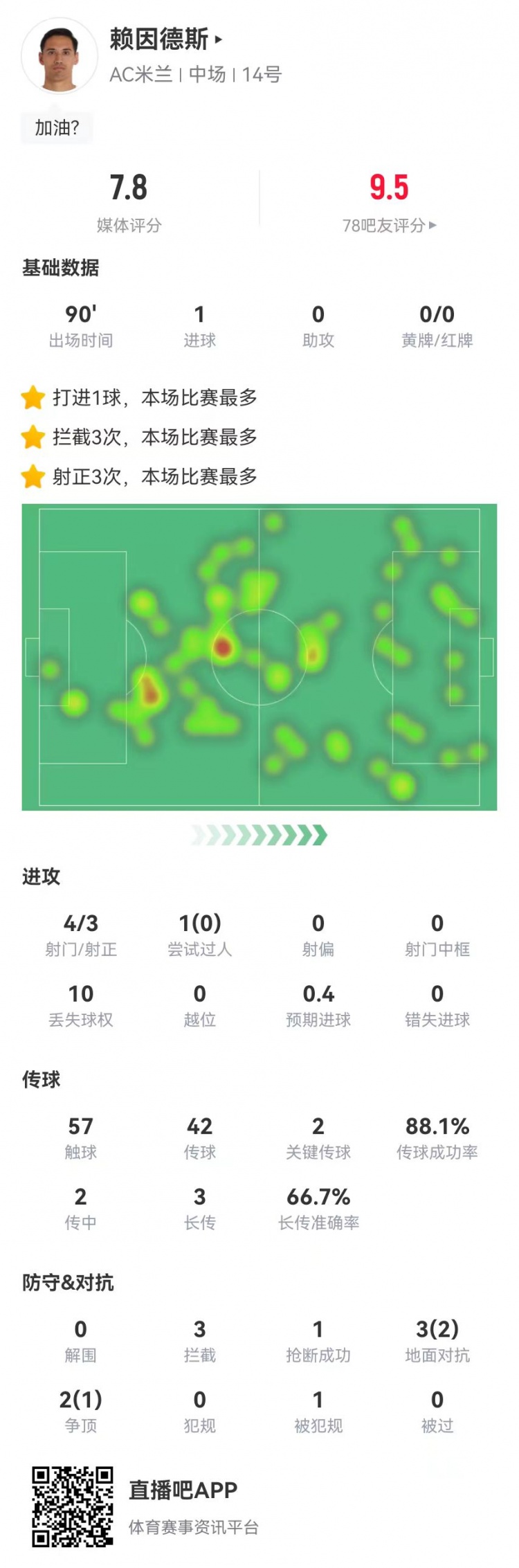 2月3日訊 米蘭在本輪意甲1-1戰(zhàn)平國(guó)米,賴因德斯本場(chǎng)數(shù)據(jù)如下: