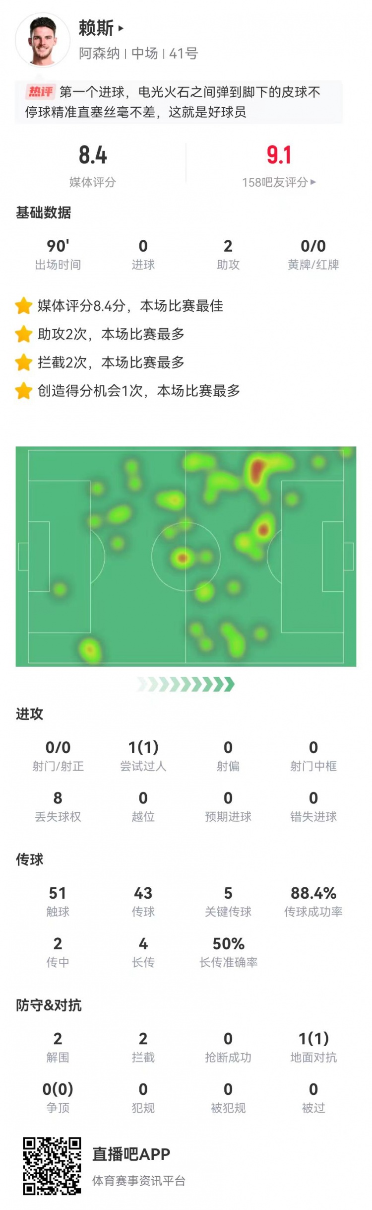 2月3日訊 阿森納在本輪英超焦點戰(zhàn)5-1大勝曼城,賴斯本場數(shù)據(jù)如下:首發(fā)踢滿全場2助攻預(yù)期助攻0.1951觸球43傳球、38成功,成功率88%5關(guān)鍵傳球2傳中、0成功4長傳、2成功1創(chuàng)造重大機會1過人、1成功1對抗、1成功8丟失球權(quán)2解圍2攔截獲評8.4分全場最高 本文標簽: 足球 英超 阿森納 曼城