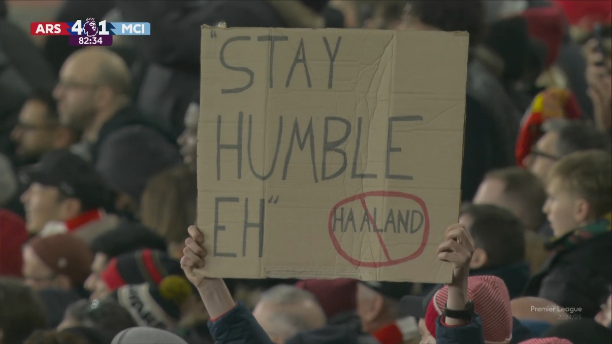 殺人誅心!看臺(tái)阿森納球迷高舉標(biāo)語(yǔ):stay humble哈蘭德