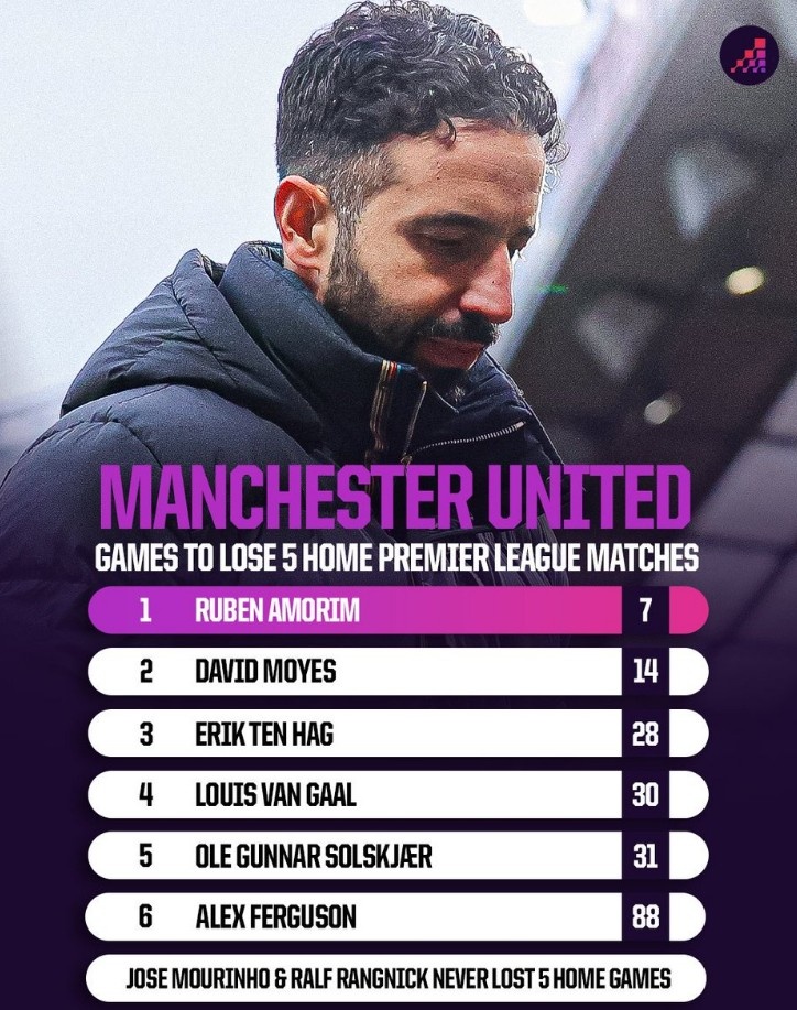 2月3日訊 在本輪英超,曼聯(lián)0-2不敵水晶宮,阿莫林執(zhí)教球隊7個英超主場輸?shù)?場。