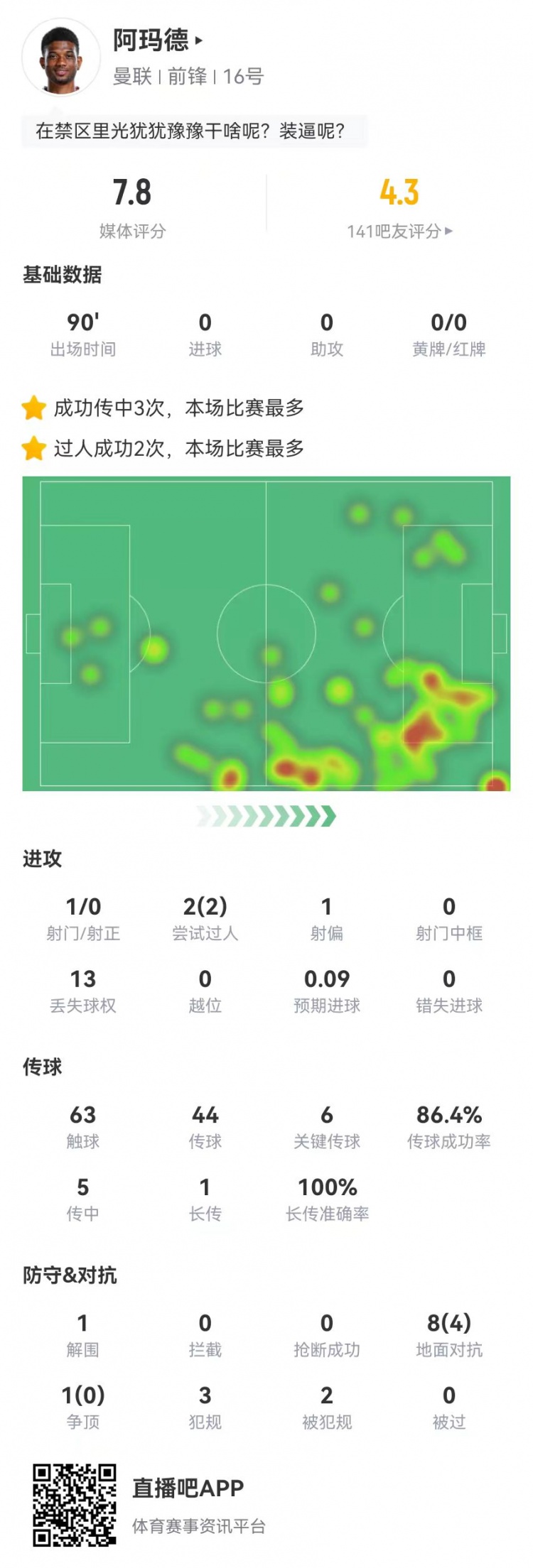 2月3日訊 曼聯(lián)在本輪英超0-2不敵水晶宮,阿瑪?shù)卤緢?chǎng)數(shù)據(jù)如下: