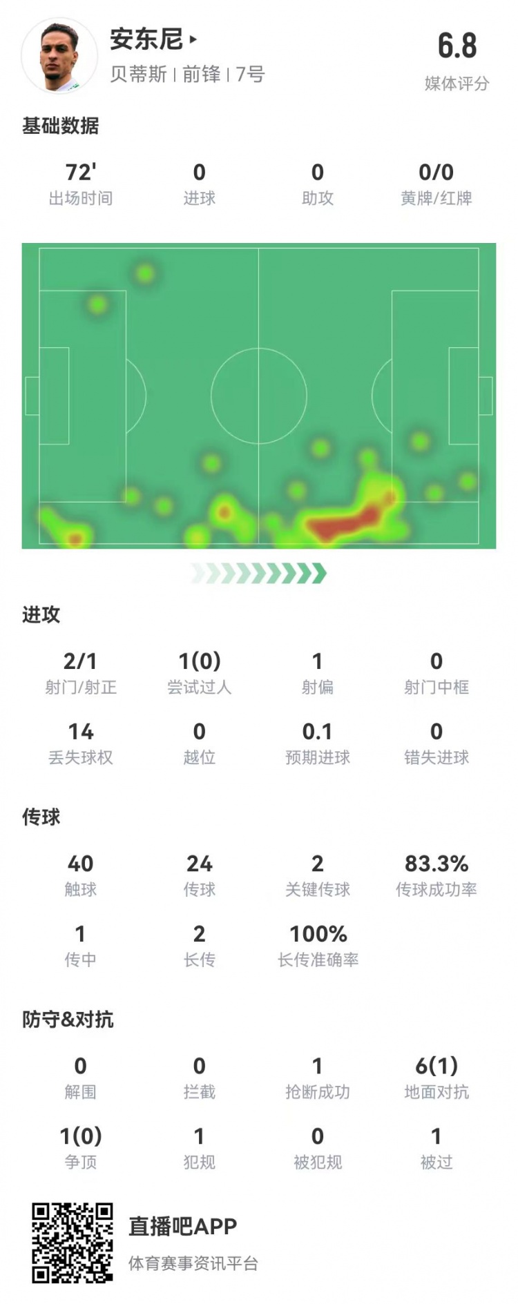 2月3日訊 貝蒂斯在本輪西甲2-2暫時(shí)戰(zhàn)平畢巴,從曼聯(lián)外租而來的安東尼首秀數(shù)據(jù)如下: