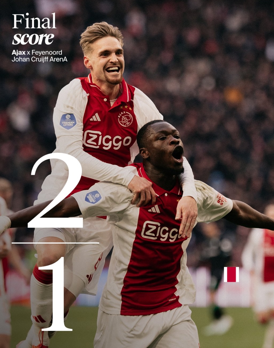 5連勝!阿賈克斯2-1絕殺費耶諾德 賈府落后榜首2分飛燕4輪不勝