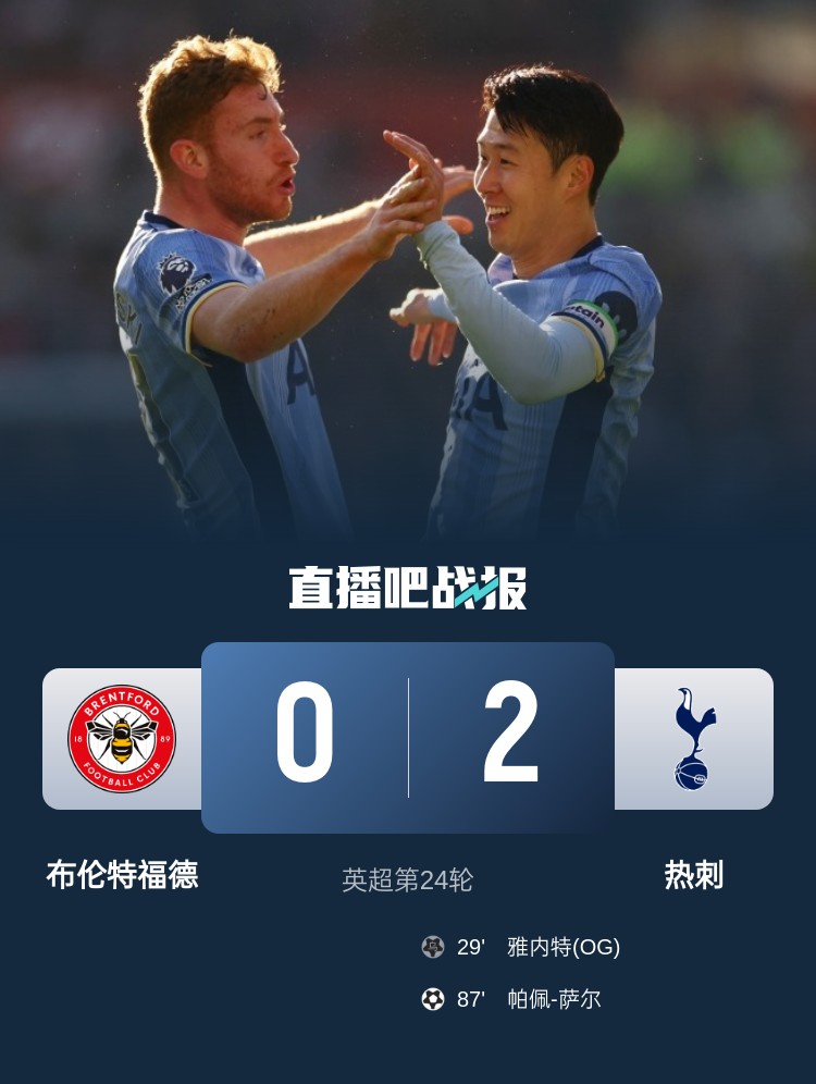 英超第24輪,熱刺2-0擊敗布倫特福德。上半場,孫興慜角球制造烏龍,雅內(nèi)特將球碰進自家球門;下半場,維薩錯失門前近距離機會,孫興慜助攻薩爾鎖定勝局。