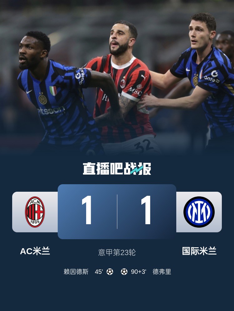 米蘭1-1國米 賴因德斯破門德弗里絕平 國米3度進球無效&3度中柱