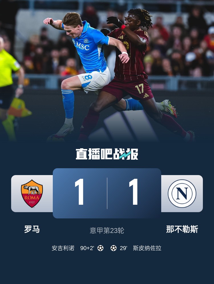意甲第23輪,羅馬1-1那不勒斯。上半場,斯皮納佐拉挑射建功;下半場,傷停補時階段安吉利諾凌空絕平。