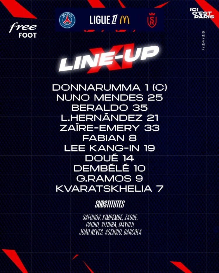 1-多納魯馬,25-努諾-門德斯,35-貝拉爾多,21-盧卡斯-埃爾南德斯,33-小埃梅里,8-法比安-魯伊斯,19-李剛?cè)剩?4-杜埃,10-登貝萊,9-貢薩洛-拉莫斯,7-克瓦拉茨赫利亞