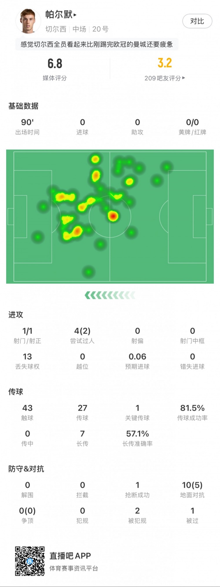 1月26日訊 英超第23輪,曼城3-1切爾西。帕爾默本場(chǎng)數(shù)據(jù):