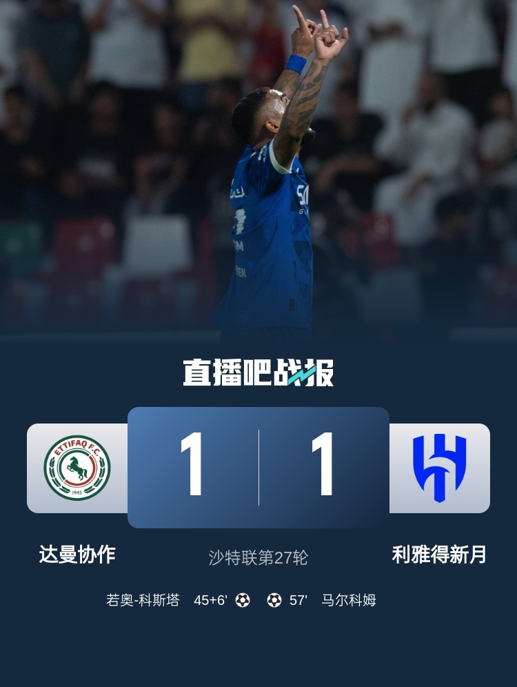 沙特聯(lián)第27輪,利雅得新月1-1達(dá)曼協(xié)作。上半場,若奧-科斯塔再補時最后時刻世界波破門;下半場,洛迪助攻馬爾科姆破門扳平比分。