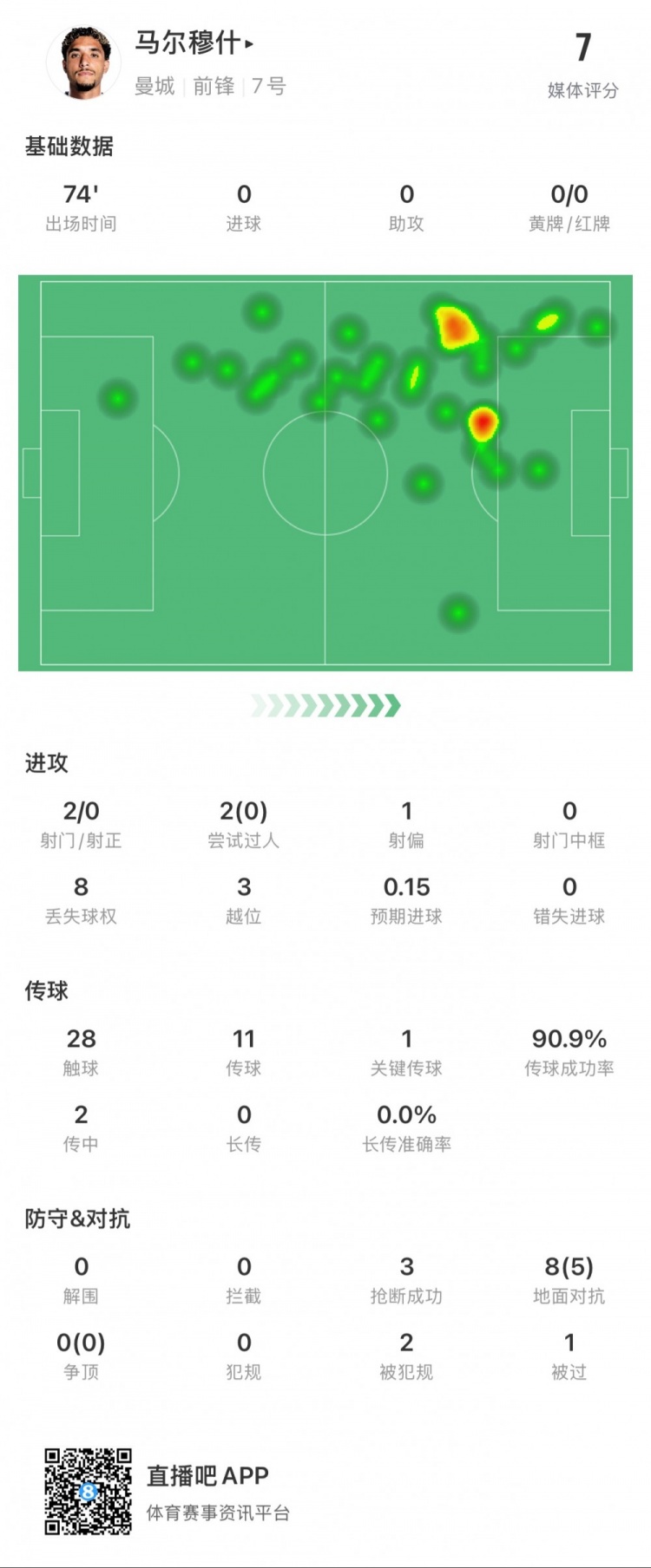 1月26日訊 英超第23輪,曼城vs切爾西。馬爾穆什上演首秀,本場(chǎng)數(shù)據(jù)如下:出場(chǎng)74分鐘2次射門0次射正2次過人0次成功28次傳球11次傳球10次成功1次關(guān)鍵傳球2次傳中1次成功1次創(chuàng)造得分良機(jī)8次地面對(duì)抗5次成功8次丟失球權(quán)2次被犯規(guī)3次越位3次搶斷1次被過 本文標(biāo)簽: 足球 英超 曼城