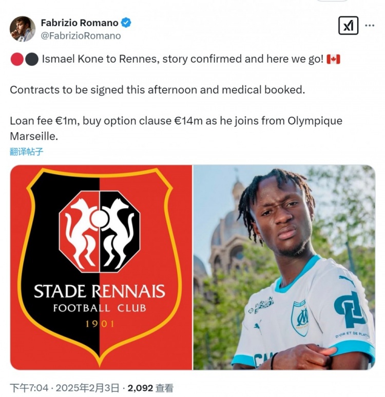 2月3日訊 據(jù)知名記者羅馬諾透露,馬賽中場(chǎng)伊斯梅爾-科內(nèi)租借加盟雷恩,Here we go!