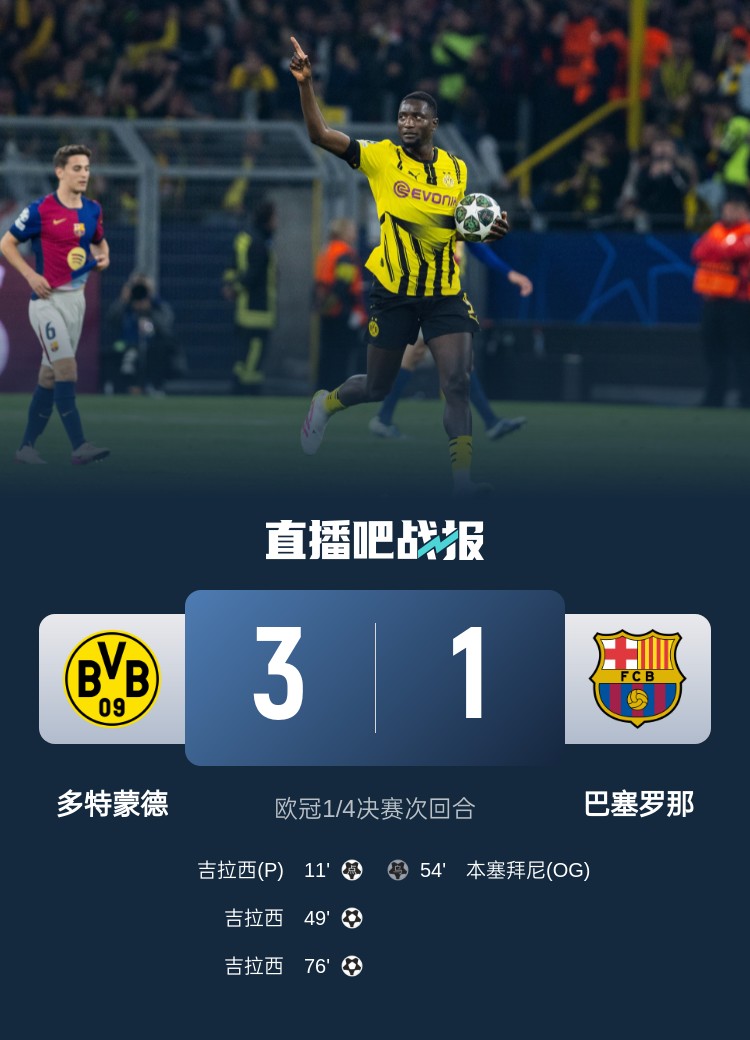 04月16日訊 歐冠1/4決賽次回合,巴薩1-3不敵多特,總比分5-3有驚無險晉級4強(qiáng)。