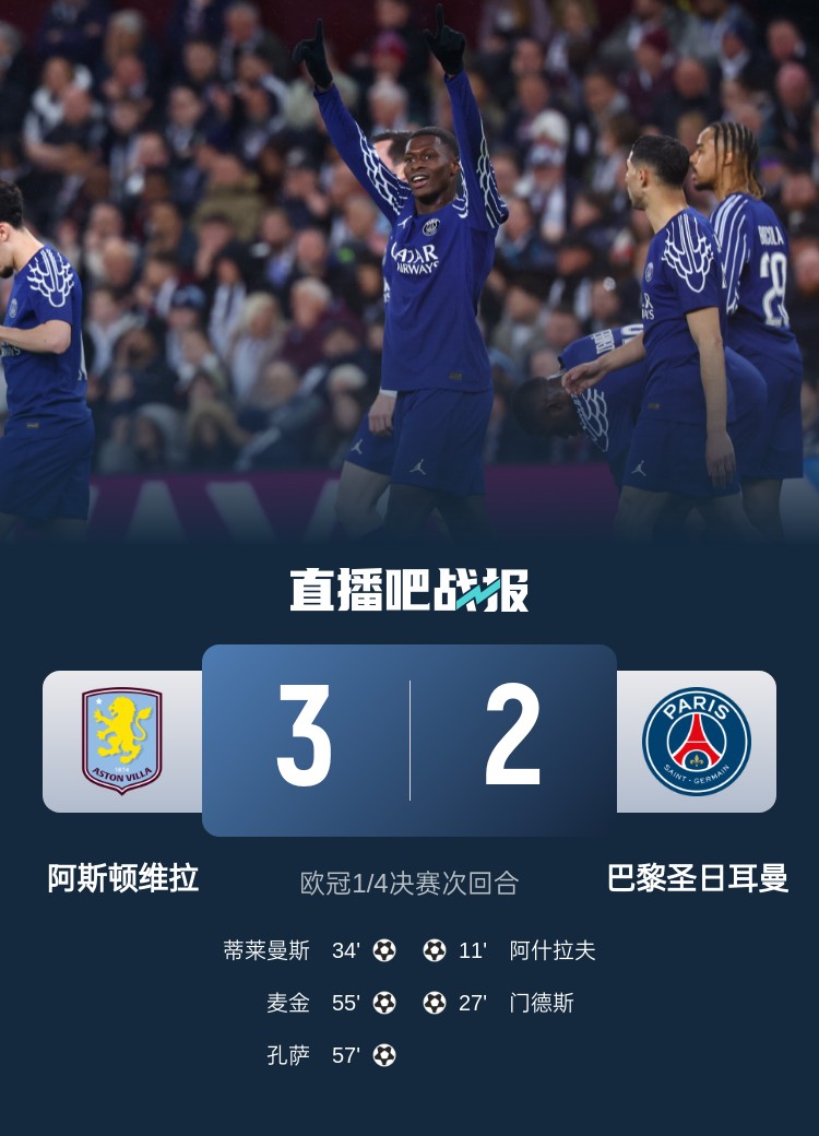 歐冠1/4決賽次回合,巴黎客場(chǎng)2-3維拉,總比分5-4驚險(xiǎn)晉級(jí)4強(qiáng)。上半場(chǎng),阿什拉夫破門,努諾-門德斯再下一城,蒂萊曼斯扳回一球;下半場(chǎng),麥金遠(yuǎn)射,拉什福德邊路強(qiáng)行爆破,助攻孔薩破門,阿森西奧錯(cuò)失扳平良機(jī),多納魯馬多次關(guān)鍵神撲。