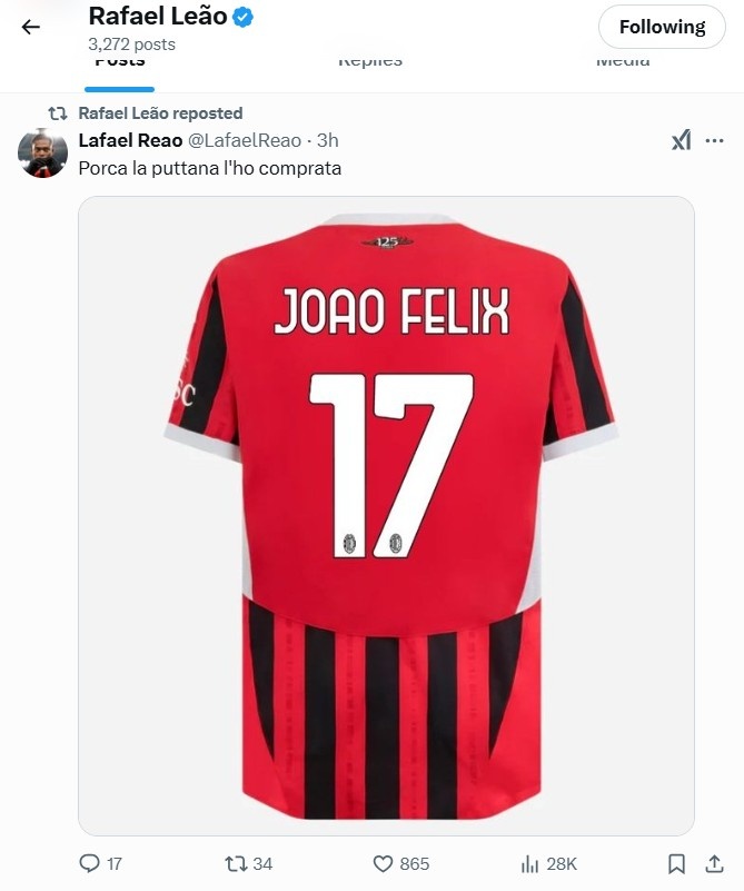 2月4日訊 羅馬諾報(bào)道,切爾西前鋒菲利克斯將租借加盟米蘭。米蘭邊鋒萊奧在社媒上轉(zhuǎn)發(fā)了一則動(dòng)態(tài),動(dòng)態(tài)中這位米蘭球迷博主表示道:“該死,我買(mǎi)了這件球衣”。圖片中是米蘭本賽季的球衣,印的名字是菲利克斯,印號(hào)是17號(hào)。 本文標(biāo)簽: 足球 英超 切爾西 意甲 AC米蘭