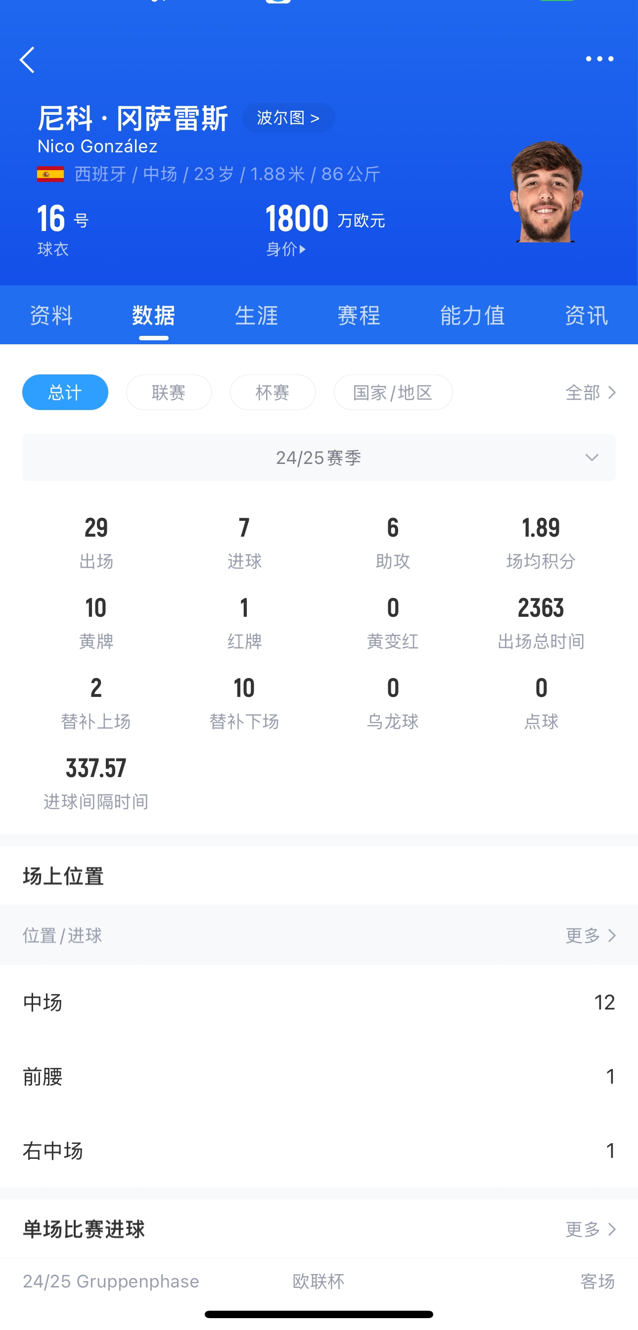 尼科-岡薩雷斯,現(xiàn)年23歲,西班牙中場,出自拉瑪西亞青訓(xùn),2023年夏窗波爾圖花費(fèi)840萬歐簽下球員,本賽季尼科代表波爾圖出戰(zhàn)29場比賽,貢獻(xiàn)7球6助,目前球員德轉(zhuǎn)身價1800萬歐。