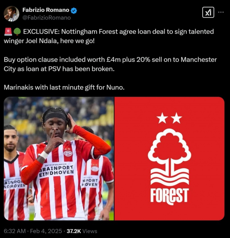 2月4日訊 羅馬諾用標(biāo)志性的here we go 確認(rèn),森林將租借18歲曼城邊鋒恩達(dá)拉,球員在埃因霍溫的租期提前結(jié)束。
