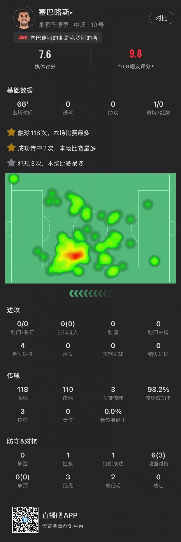 觸球:118(全場最多)