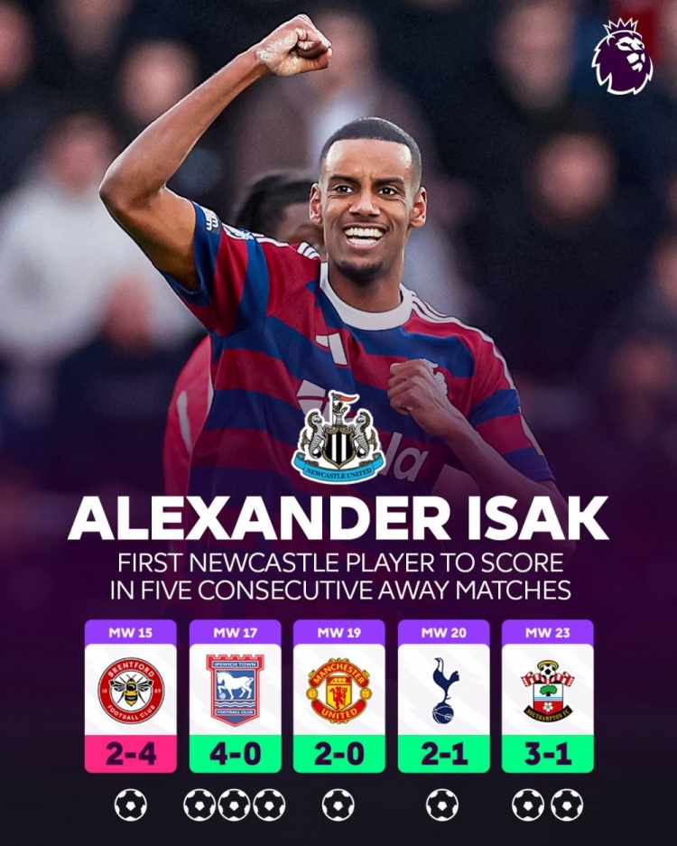 根據(jù)統(tǒng)計,伊薩克成為了紐卡隊史上第一位連續(xù)5個英超客場比賽取得進(jìn)球的球員。