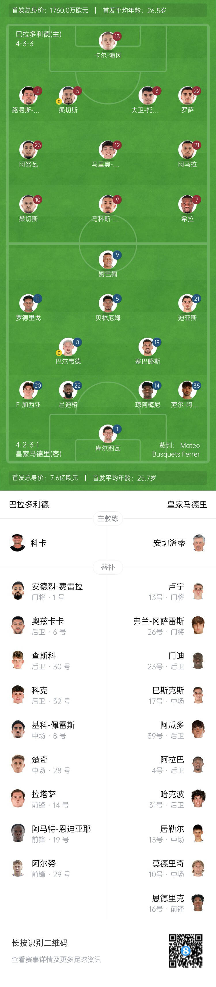 巴拉多利德首發(fā):13-卡爾-海因、2-路易斯-佩雷斯、5-哈維-桑切斯、3-大衛(wèi)-托雷斯、22-盧卡斯-羅薩、12-馬里奧-馬丁、21-阿馬拉、10-伊萬- 桑切斯、23-安努亞爾、7-馬馬杜-西拉、9-馬科斯-安德烈