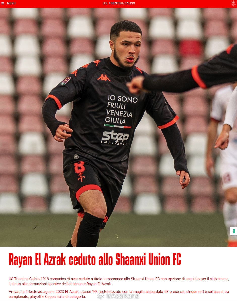 意丙聯(lián)賽球隊(duì)的里雅斯特人(US Triestina)官方宣布,該隊(duì)的荷蘭球員拉揚(yáng)·埃爾阿茲拉克(Rayan El Azrak)以租借并附買斷條款的方式加盟中甲新軍陜西聯(lián)合。埃爾阿茲拉克今年25歲,司職中場/邊鋒。曾在阿賈克斯、烏特勒支等隊(duì)接受青訓(xùn),后效力于芬洛、馬斯特里赫特等隊(duì),2023年夏天加入的里雅斯特人,為該隊(duì)出場58次,打進(jìn)5球。