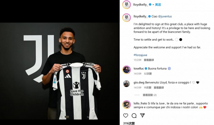 凱利通過(guò)社媒曬出自己手持尤文球衣的加盟照,并配文:“你好(ciao,意大利語(yǔ)),@尤文圖斯俱樂(lè)部。”