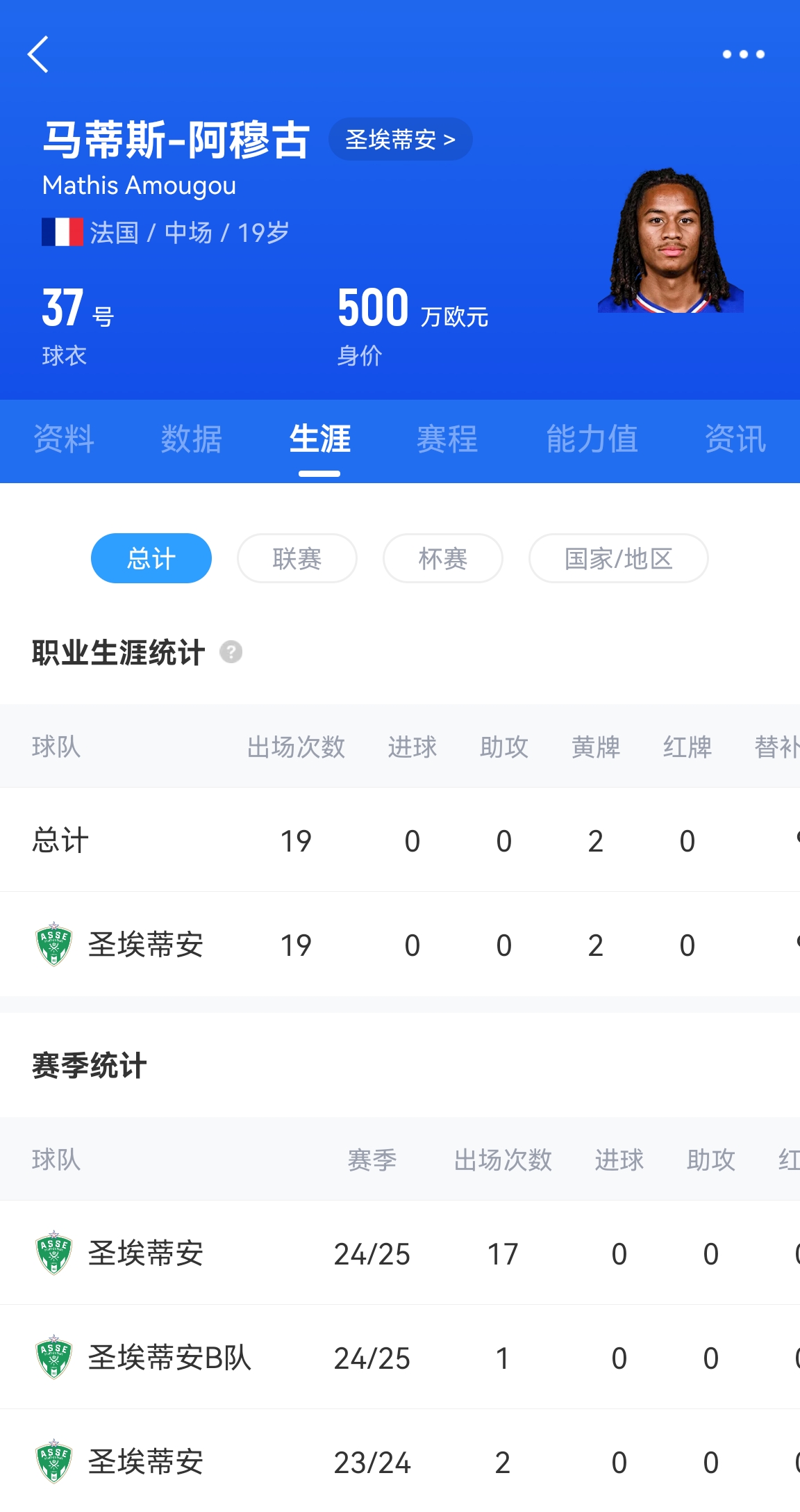 阿穆古是圣埃蒂安青訓(xùn)出身,上賽季完成一線隊(duì)首秀,截至目前共為圣埃蒂安一隊(duì)出場19次。