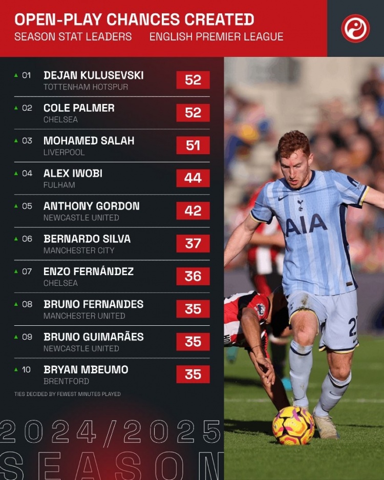 本賽季英超運動戰(zhàn)創(chuàng)造機會榜: