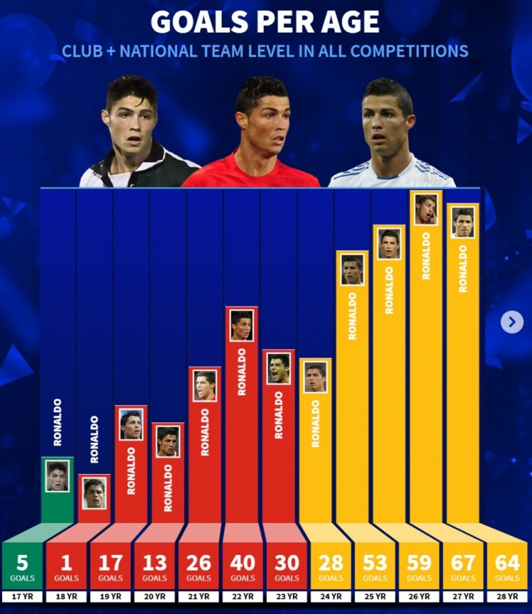 德轉(zhuǎn)列C羅生涯進(jìn)球情況:17歲打進(jìn)5球,27歲67球最多,39歲50球
