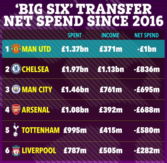 2016年以來英超BIG6支出、收入、凈支出排行(單位:英鎊):