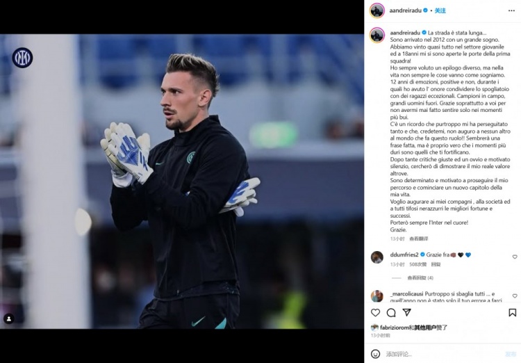 拉杜寫(xiě)道:“這是一段很長(zhǎng)的道路。2012年,我懷揣偉大的夢(mèng)想來(lái)到了國(guó)米,我們幾乎贏得了青年賽事的所有冠軍。18歲的時(shí)候,一線(xiàn)隊(duì)的大門(mén)向我敞開(kāi)。我一直想要一個(gè)不同的結(jié)局,但生活并不總是按照我們的想法進(jìn)行。”