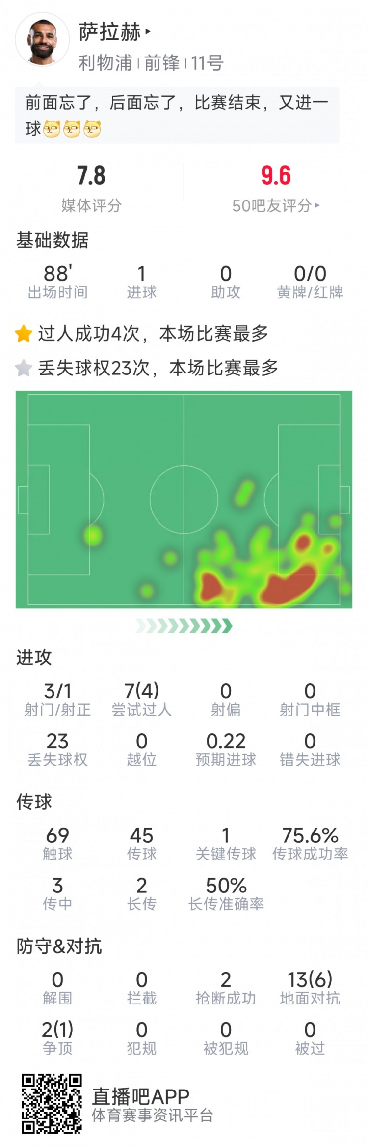 1月26日訊 在本輪英超,利物浦4-1大勝伊普斯維奇。薩拉赫本場(chǎng)打進(jìn)一球,以下為他在本場(chǎng)數(shù)據(jù):比賽時(shí)間90分鐘1粒進(jìn)球3射1正7次過(guò)人4次成功1次關(guān)鍵傳球傳球成功率75.6%2次搶斷15次對(duì)抗7次成功sofa評(píng)分7.8分 本文標(biāo)簽: 足球 英超 利物浦