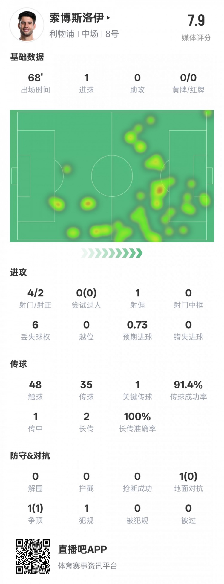 1月26日訊 英超第23輪,利物浦主場(chǎng)迎戰(zhàn)伊普斯維奇,索博斯洛伊首發(fā)出戰(zhàn),貢獻(xiàn)1粒進(jìn)球,送出1次關(guān)鍵傳球,傳球成功率達(dá)到91.4%,評(píng)分7.9。