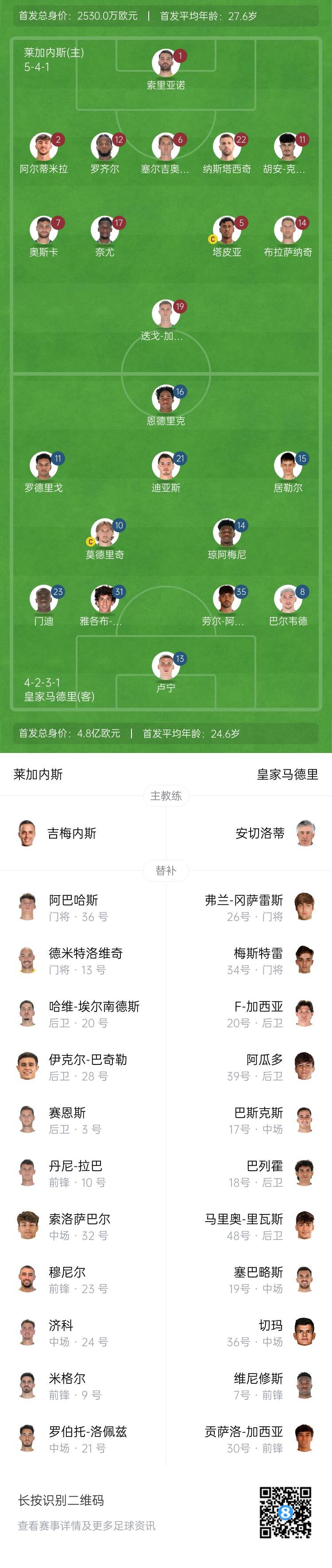 萊加內(nèi)斯首發(fā):1-胡安-索里亞諾、2-阿德里亞-阿爾蒂米拉、12-瓦倫丁-羅齊爾、6-塞爾吉奧-岡薩雷斯、22-納斯塔西奇、11-胡安-克魯斯、17-伊萬(wàn)-內(nèi)尤、5-雷納托-塔皮亞、7-奧斯卡-羅德里格斯、14-布拉薩納茨、19-迭戈-加西亞