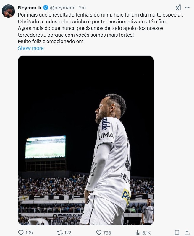2月6日訊 圣保羅州聯(lián)賽,桑托斯1-1博塔弗戈SP。本場(chǎng)比賽,內(nèi)馬爾替補(bǔ)出場(chǎng),上演了回歸桑托斯的首秀,賽后內(nèi)馬爾更新了社媒。