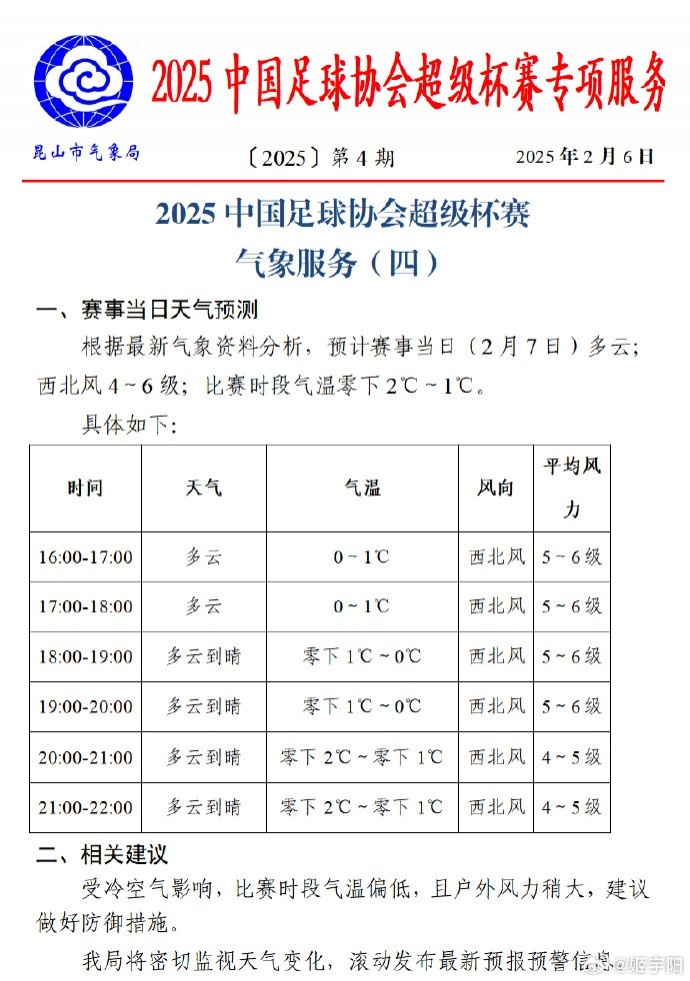 2月6日訊 媒體人姬宇陽曬照,明晚超級杯比賽期間昆山氣溫在零度以下。明晚19:35,2025年中國足球開年大戲超級杯賽將在昆山奧體中心專業(yè)足球場進(jìn)行,由上賽季中超和足協(xié)杯雙料冠軍上海海港對陣中超亞軍上海申花。根據(jù)天氣預(yù)報的情況,預(yù)計賽事當(dāng)天昆山為多云天氣,西北風(fēng)4-6級,比賽時段氣溫零下2度-零下1度。(圖片來源:姬宇陽) 本文標(biāo)簽: 足球 中超 中國足球 上海海港 上海申花